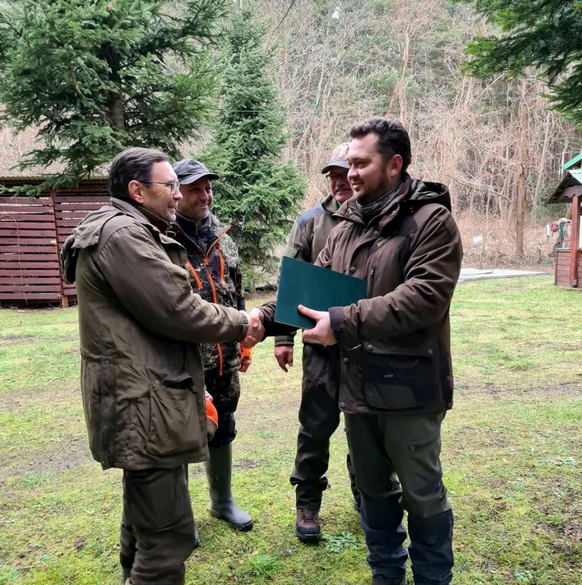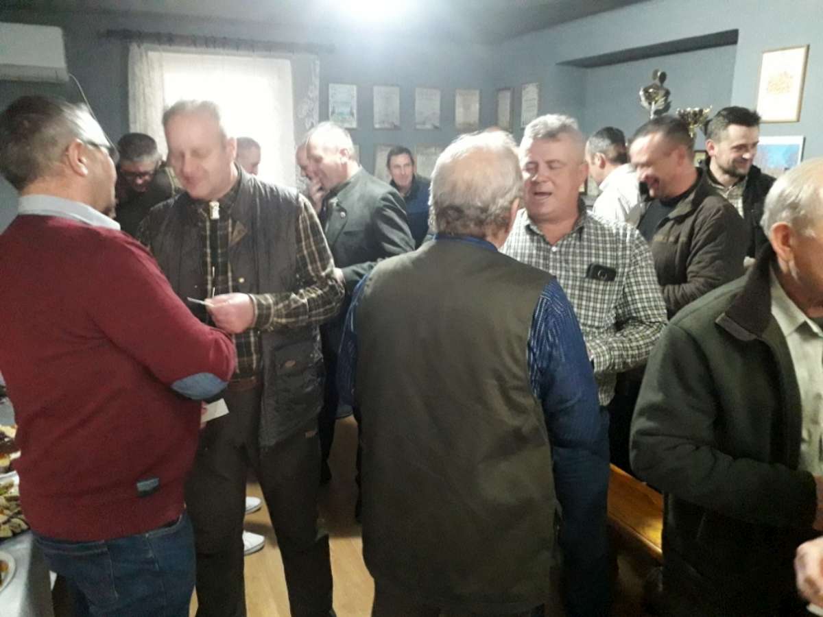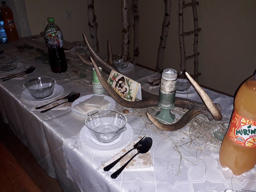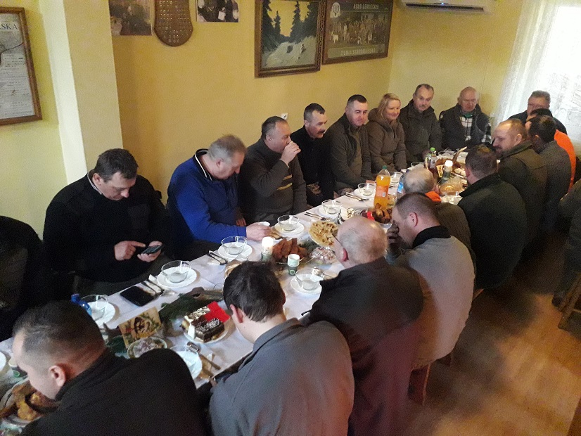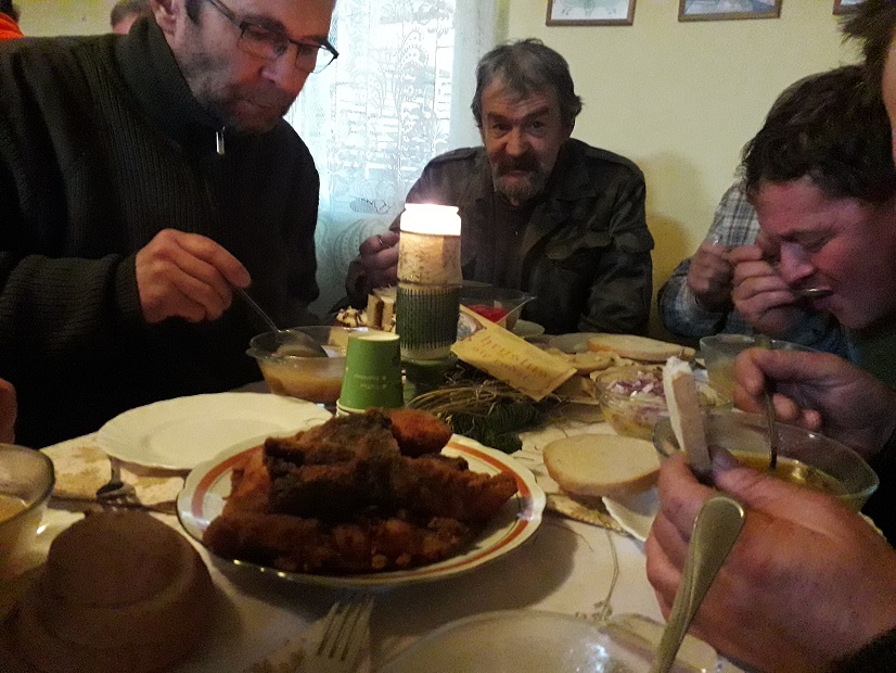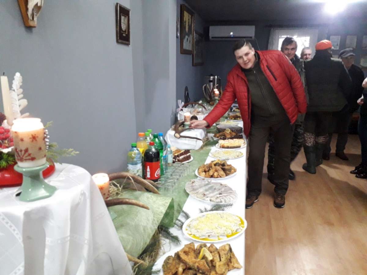 Łowy zakończone, a więc czas na część, dla której dzisiaj się tu spotkaliśmy. Najpierw kilka słów od Kolegi Prezesa Andrzeja Sieciarskiego, który oficjalnie rozpoczyna spotkanie opłatkowe, składając wszystkim życzenia oraz dziękując za obecność przy wspólnym, łowieckim, wigilijnym stole. Następnie Kolega Ksiądz Marek, zgodnie z tradycją odczytuje Słowo Boże, odmawia krótką modlitwę oraz trzymając w ręku kawałek białego opłatka, częstuje nas jak zwykle dobrym, serdecznym i dodającym otuchy w tych trudnych dla łowiectwa czasach słowem. Zebraliśmy się dosyć licznie. Nie przeszkadza to jednak aby po wspólnym odśpiewaniu kolęd każdy każdemu osobiście uścisnął dłoń, przełamał się opłatkiem i tak zwyczajnie, po ludzku od serca złożył życzenia. Kiedy na stole goszczą wazy z grzybowym barszczem wszyscy grzecznie i po cichu zasiadają za stołem. Nawet najgłośniejsza sygnałówka nie jest tak w stanie uciszyć łowieckiego gwaru jak woń wigilijnych potraw, pieczołowicie przygotowywanych przez Koleżankę Sabinę, dzięki której mogliśmy pokosztować m.in. wcześniej wspomnianego barszczu, pieczonego karpia czy przesmacznych pierogów, popijając wszystko tradycyjnym kompotem z suszonych owoców, z których to słynie nasza sandomierska ziemia. Tak wspaniała uczta nie może odbyć się bez deseru. Tę część, jak to zwykle bywa, rezerwuje sobie niesamowicie utalentowany cukiernik Kolega Andrzej, przygotowując ciasta z niemal zegarmistrzowską dokładnością, cieszące zarówno oko jak i podniebienie. Wszystko to, przy akompaniamencie trzaskających w kominku iskier, okraszone jest rozmowami oraz licznymi opowieściami, którym z uwagą przysłuchują się stażyści, nieświadomi jeszcze tego jak bardzo łowiectwo wrośnie wkrótce w ich życie oraz serca. Tu nie ma panów, nie ma jegomości, same bratnie dusze i Koledzy po strzelbie. Bo czyż nie cieszą ucha opowieści o dziku, który jeszcze rano będąc średniej wielkości przelatkiem już popołudniu osiąga rozmiary niemal medalowego odyńca, lub też