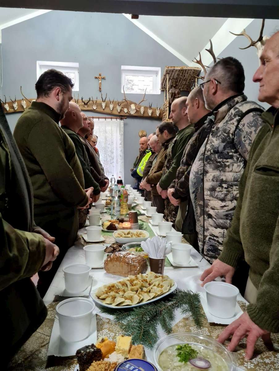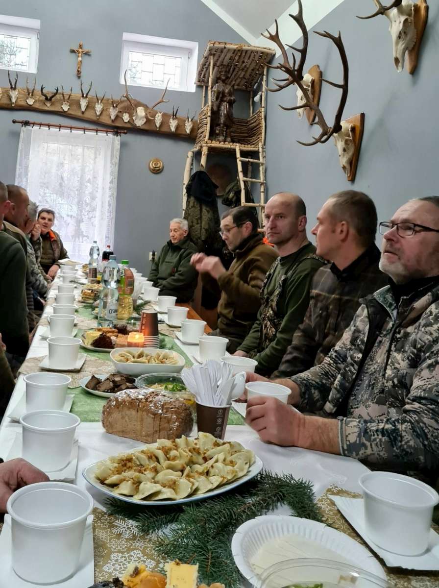 Chłodnym, niedzielnym porankiem myśliwi Koła Łowieckiego „Ziemia Sandomierska” stawili się na zbiórce przed Domkiem Myśliwskim w Beszycach. Odświętnie przystrojony sianem i igliwiem ogromny wspólny stół, ubrany w biały obrus wskazuje na to, że nie będzie to zbiórka przed zwykłym polowaniem. Jest 23 grudnia, rozpoczynamy jedyne w roku i zawsze wyczekiwane Polowanie Wigilijne. Oczywiście wszelkie prawidła łowieckie muszą zostać zachowane, także najpierw odprawa. Łowczy – Kolega Rafał Gospodarczyk – dzieli myśliwych na grupy, przypomina o przestrzeganiu regulaminu a także prezentuje plan, gdzie i na jakie gatunki zwierzyny będziemy polować. Ruszamy więc w łowisko. Nietypowy jak na tę porę roku dzień przypomina bardziej przedwiośnie niż pierwsze dni astronomicznej zimy. Polujemy krótko, tylko kilka miotów do południa. Po udanym polowaniu wracamy wszyscy z powrotem na domek, żeby na wspólnym pokocie podziękować Świętemu Hubertowi za udane i jak to zwykł mawiać jeden z naszych kolegów „przesympatyczne polowanie”.